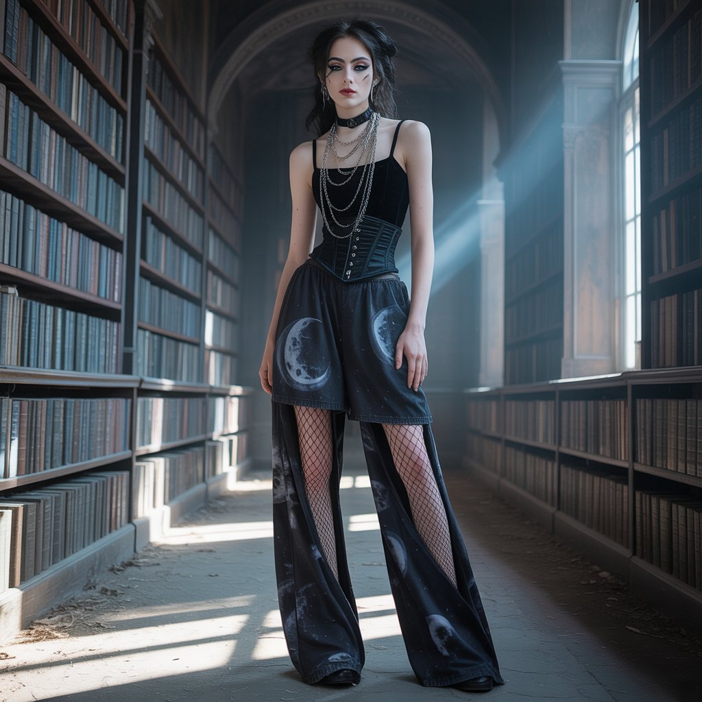 The hybrid emo goth look merges gothic mystery with emotional depth—dramatic makeup, chains, lace, and studded belts. It’s rebellious yet stylish, mysterious yet expressive.